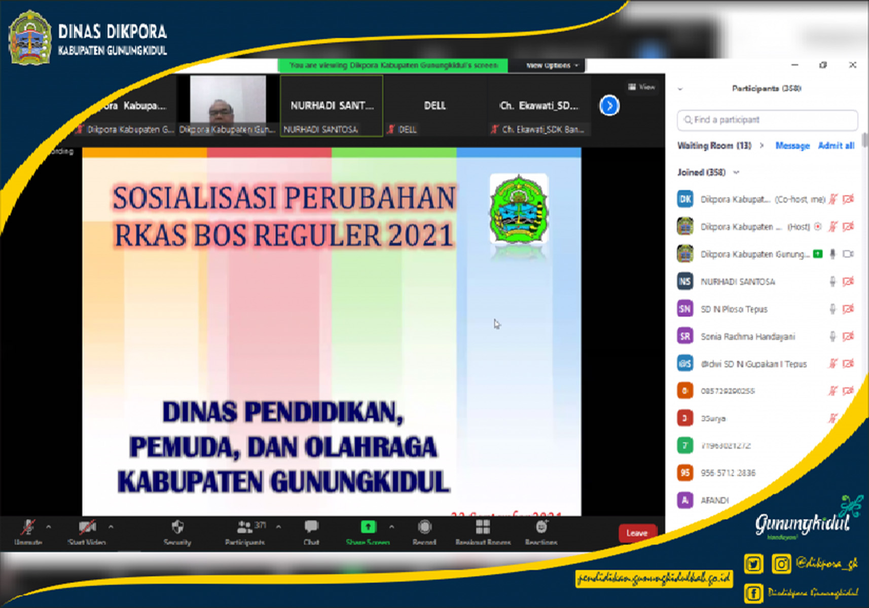 WONOSARI- Dinas Pendididkan, Pemuda, dan Olahraga (Disdikpora) Kabupaten Gunungkidul melalui Subbagian Perencanaan menyelenggarakan kegiatan Sosialisasi Bantuan Operasional Sekolah (BOS) Perupahan RKAS Jenjang Sekolah Dasar (SD) dan Sekolah Menegah Pertama (SMP) tahun 2021. Kegiatan diselenggarakan secara virtual dibagi menjadi dua sesi dengan sesi pertama diikuti oleh jenjang SD yang kemudian dilanjutkan sesi ke- dua untuk jenjang SD dan SMP.